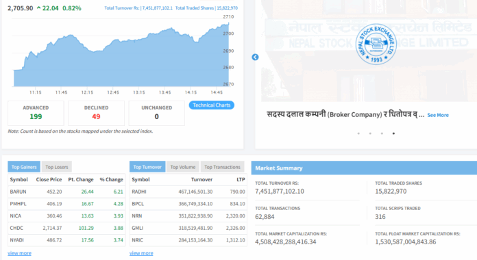 विराटचोकः लगातार दुई दिन घटेको शेयर बजार आज दाहोरो अंकले बढेर पुनः २७०० कै लाइनमा पुगेको छ । आज नेप्से परिसूचक ० दशमलव ८२ प्रतिशत अर्थात २२ दशमलव ०४ अंकले बढेर २ हजार ७०५ दशमलव ९० बिन्दुमा पुगेको छ ।
