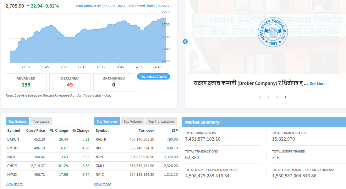 बजार बढेसँगै समग्र बजार पूँजीकरण ४५ खर्ब ८ अर्ब ४२ करोड ८२ लाख ८८ हजार ४१६ रुपैयाँ कायम भएको छ ।