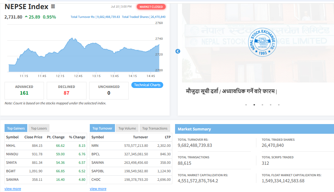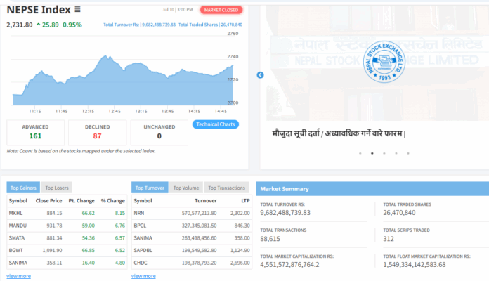 विराटचोकः यस साता नेप्से परिसूचक १ प्रतिशत बढेर बन्द भएको छ । गत साता २७०३ दशमलव ९६ विन्दुमा बन्द भएको नेप्से यस साता १ दशमलव ०३ प्रतिशत अर्थात् २७ दशमलव ८४ अङ्क बढेर २७३१ दशमलव ८० बिन्दुमा पुगेको छ ।