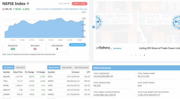 विराटचोकः चालु आर्थिक वर्षको अन्तिम दिन आज नेपाल स्टक एक्सचेञ्च(नेप्से) परिसूचक १ दशमलव २५ प्रतिशत अर्थात् ३४ दशमलव ६१ अङ्कले बढेर २ हजार ७९४ दशमलव ७८ विन्दुमा अडिएको छ । फागुन १९ पछि पहिलो पटक कारोबार रकमले १४ अर्ब टेकेको हो । आज १४ अर्ब ३ करोड ४८ लाख ३९ हजार ८८० रुपैयाँको शेयर किनबेच भएको छ ।