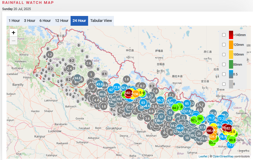 विगत २४ घण्टामा इलामको माईपोखरी केन्द्रमा १८२.२ मिलिमिटर वर्षामापन भएको छ । इलामका इलाम चियाबगान, कन्याम चियाबगान, जितपुर, हिमाली गाउँमा पनि भारी वर्षा भएको छ ।
