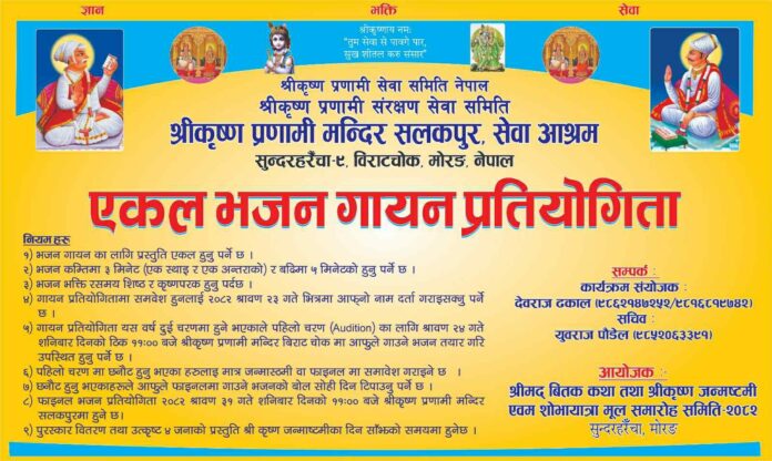 विराटचोकः श्रीकृष्ण प्रणामी सेवा समिति नेपाल तथा श्रीकृष्ण प्रणामी संरक्षण सेवा समितिको संयुक्त आयोजनामा श्रीकृष्ण प्रणामी मन्दिर सलकपुर, सेवा आश्रम सुन्दरहरैंचा–९, विराटचोकमा एकल भजन गायन प्रतियोगिता हुने भएको छ ।