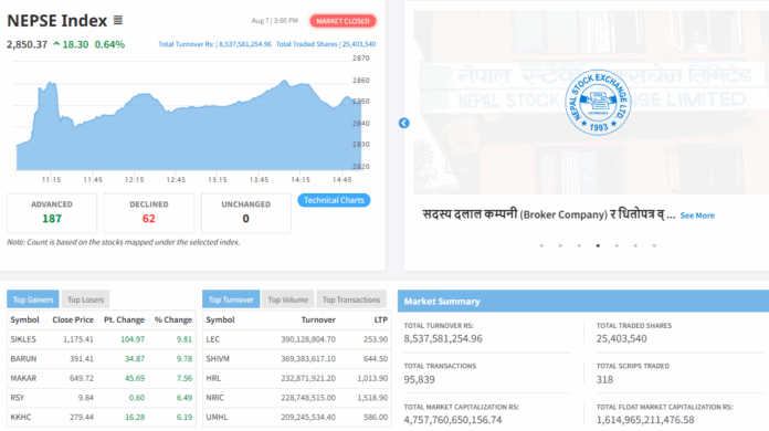 बिहीबार नेप्से परिसूचक १८ दशमलव ३० अङ्क बढेर २८५०.३७ विन्दुमा पुगेको छ ।