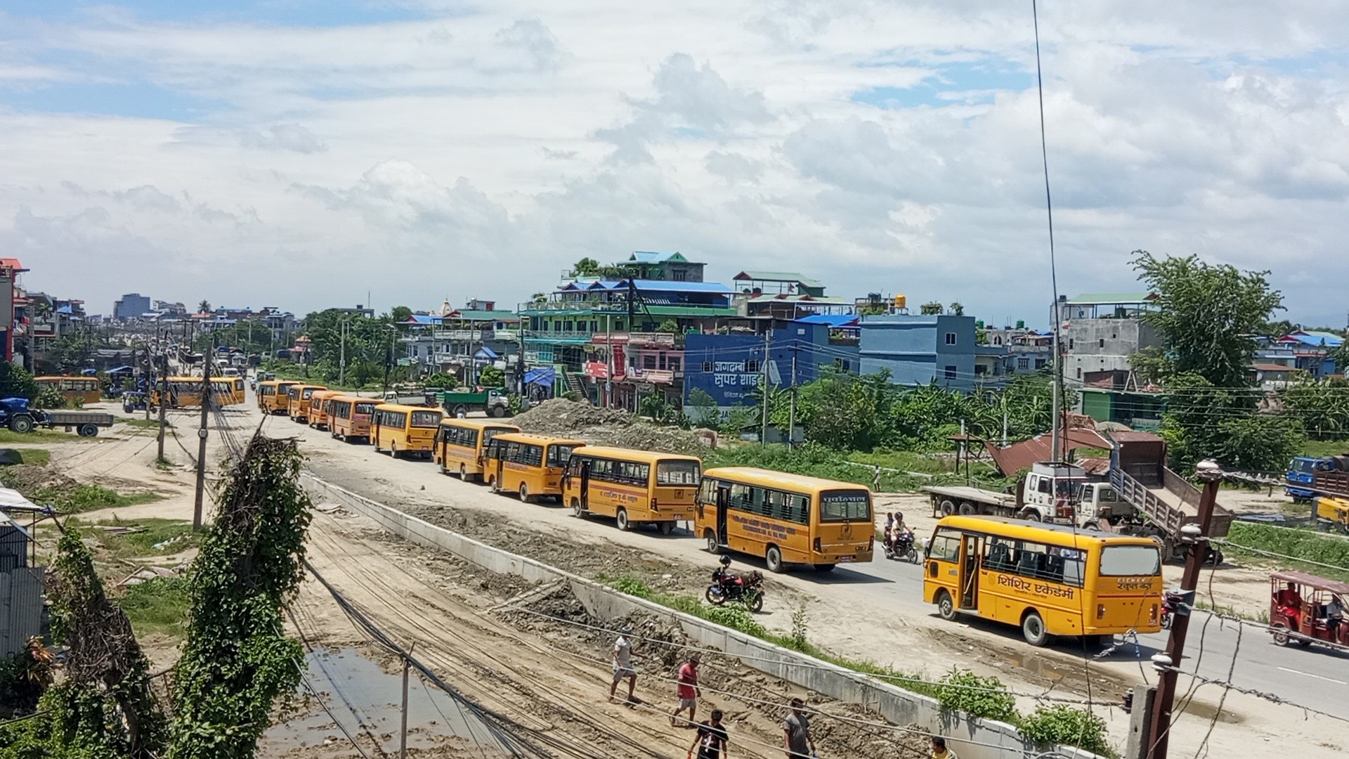विराटचोकः शुक्रबार बिहान ११ बजे सुन्दरहरैंचा नगरपालिकाको प्रवेशद्वारको सामुन्ने नगरभित्रका निजी शैक्षिक संस्थाका दर्जनौँ सवारी साधनको लाइन थियो । १० बजे विद्यार्थीलाई विद्यालयमा पुर्याएर सवारी साधन नगरपालिका अगाडि ल्याइएको थियो । सबै सवारी साधनमा कालो झण्डा राखिएको थियो ।