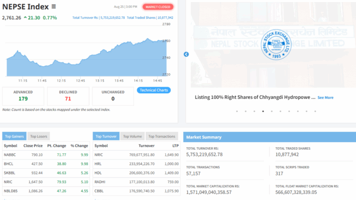 विराटचोकः तीजको अघिल्लो दिन आज नेप्से परिसूचक २१ दशमलव ३० अङ्क बढेर २७६१ दशमलव २६ बिन्दुमा अडिएको छ । नेप्से बढे पनि कारोबार रकम भने घटेको छ । हिजो साढे ६ अर्ब रुपैयाँबराबरको शेयर किनबेच भएको बजारमा आज ३१७ कम्पनीको ५७ हजार १५७ पटकको कारोबारमा ५ अर्ब ७५ करोड ३२ लाख १९ हजार ६५२ रुपैयाँको शेयर किनबेच भएको छ ।