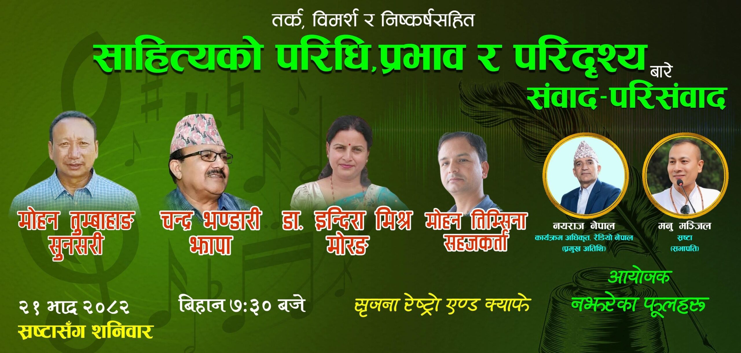 आयोजक संस्था नझरेका फूलहरूका अध्यक्ष केपी घिमिरेका अनुसार मोहन तिम्सिनाको सहजीकरणमा हुने परिसंवाद कार्यक्रममा सुनसरीका मोहन तुम्बाहाङ, झापाका चन्द्र भण्डारी मोरङकी डा. इन्दिरा मिश्र वक्ताको रूपमा सहभागी हुनुहुनेछ ।