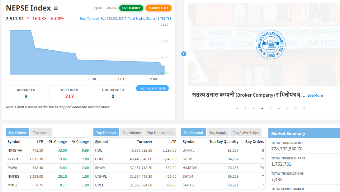 विराटचोकः आजका लागि शेयर कारोबार बन्द भएको छ । बजार खुलेको जम्मा ६ मिनेटको समयमा ६ प्रतिशतले नेप्सेमा गिरावट आएपछि आजका लागि कारोबार बन्द भएको हो । प्रि ओपन सेसनबाहेक आज शेयर बजार ६ मिनेट मात्रै कारोबार भयो ।