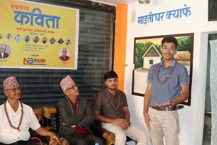 विराटचोकः शनिबार इटहरीस्थित धरानलाइनमा रहेको माइतीघर क्याफेमा ८ जना कविले आफ्ना रचना सुनाएका छन् । नेपालबिट मिडिया प्रालिले सञ्चालन गर्दै आएको क्याफेमा कविताको आठौं शृङ्खलामा नयाँ पुस्ताका ८ जना कविले कविता वाचन गर्नुभएको हो ।