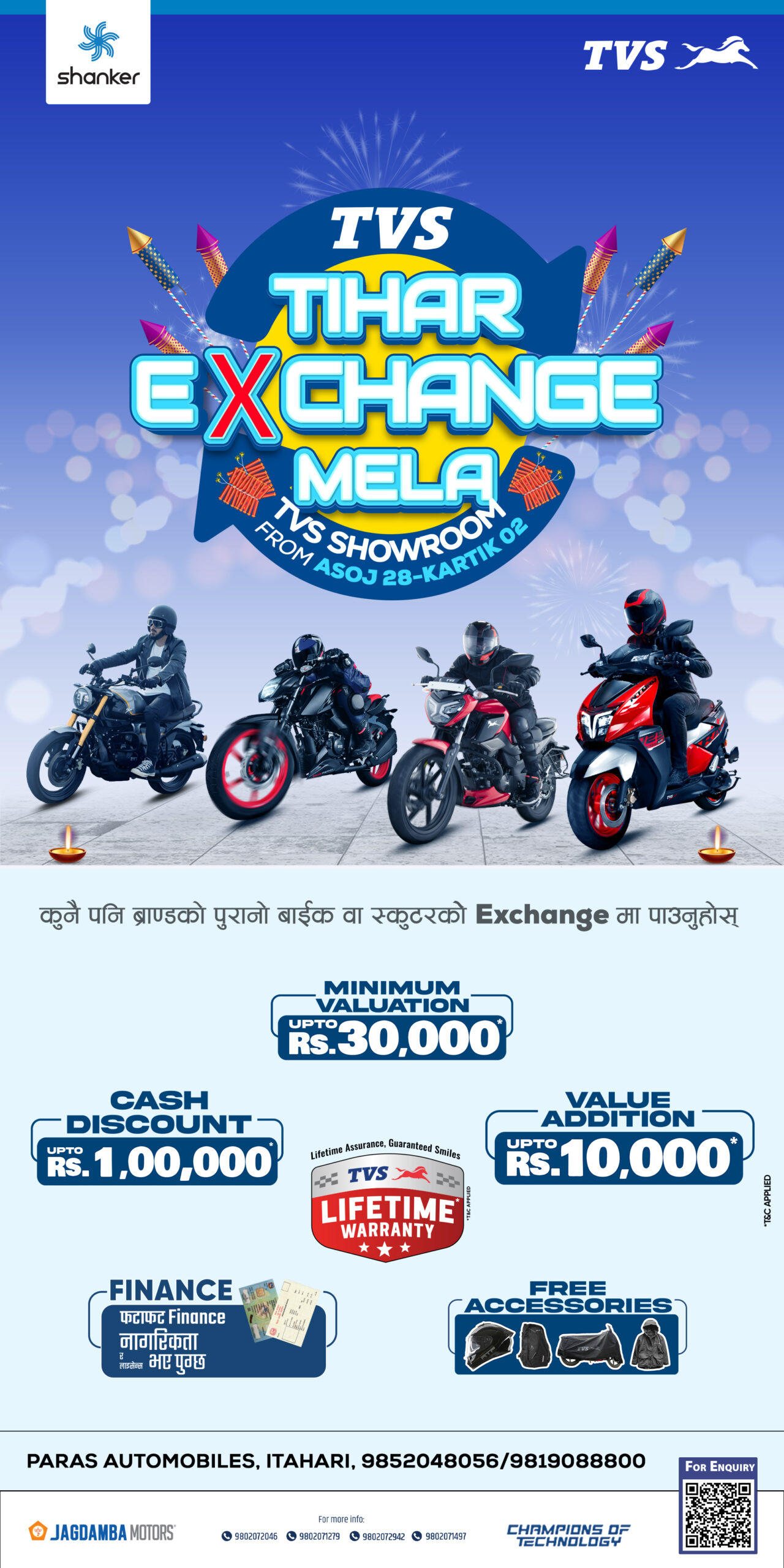 इटहरीः तिहारको अवसरमा पारस अटोमोबाइल्स, इटहरीले असोज २८ गते शुरु गरेको ‘टीभीएस तिहार एक्सचेन्ज मेला’ आज सकिने भएको छ ।