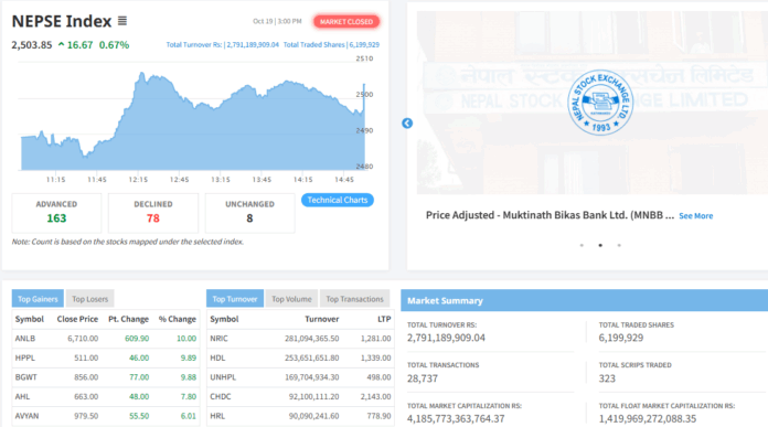 विराटचोकः कात्तिक महिनाको पहिलो कारोबार दिन शेयर बजार मापक नेप्से परिसूचक १६.६७ अंक बढेर २५०३.८५ विन्दुमा अडिएको छ । बजार बढे पनि कारोबार रकम भने घटेको छ ।