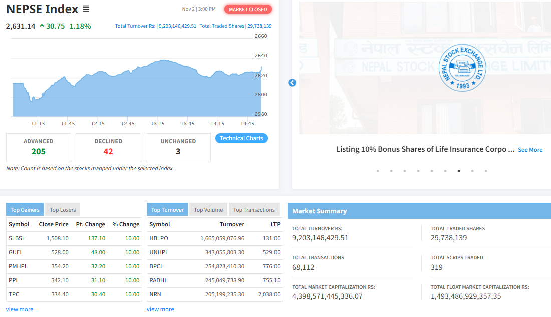 विराटचोकः साताको पहिलो दिन आज शेयर बजारमा हरियाली छाएको छ । आज नेप्से परिसूचक १.१८ प्रतिशत अर्थात ३०.७५ अंकले बढेर २ हजार ६३१.१४ विन्दुमा पुगेको छ ।