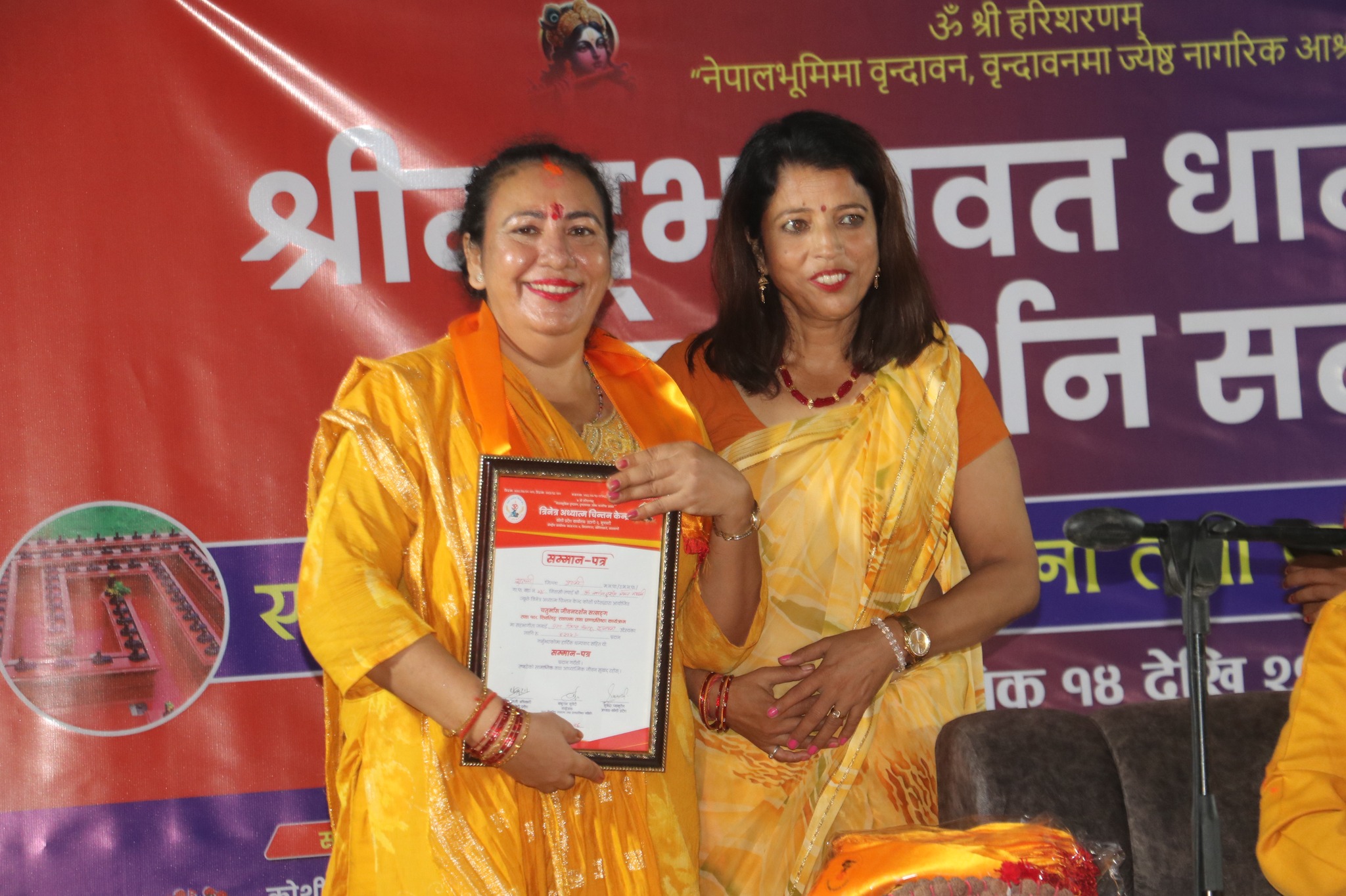 इटहरीः सुनसरीको इटहरी–२, आयुर्वेदिक टोलस्थित त्रिनेत्र अध्यात्म चिन्तन केन्द्रमा जारी श्रीमद्भागवत धान्याञ्चल सत्सङ्गअन्तर्गत आज १०८ शिवलिङ्ग स्थापना गर्नेहरूलाई सम्मानपत्र प्रदान गरिएको छ ।