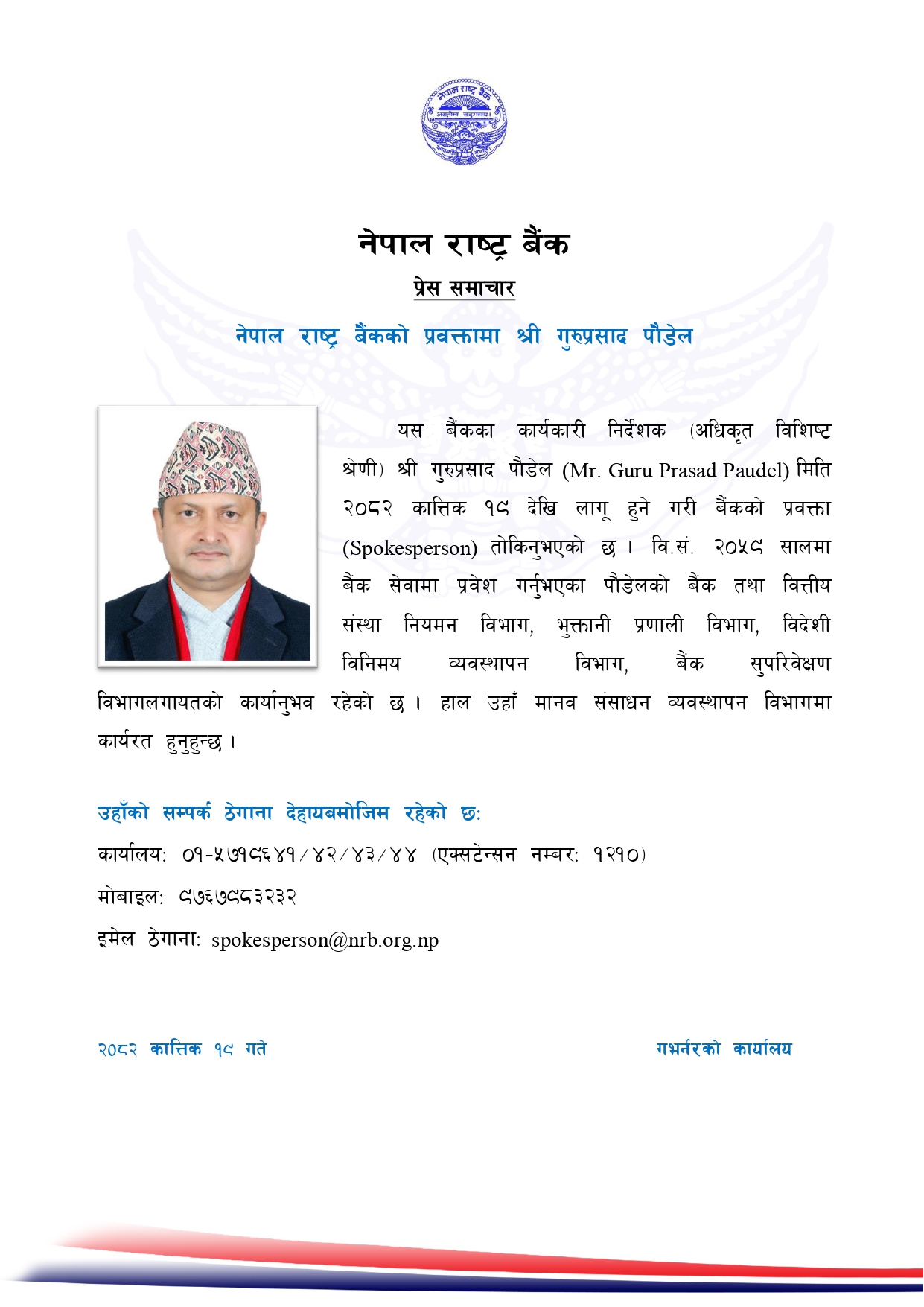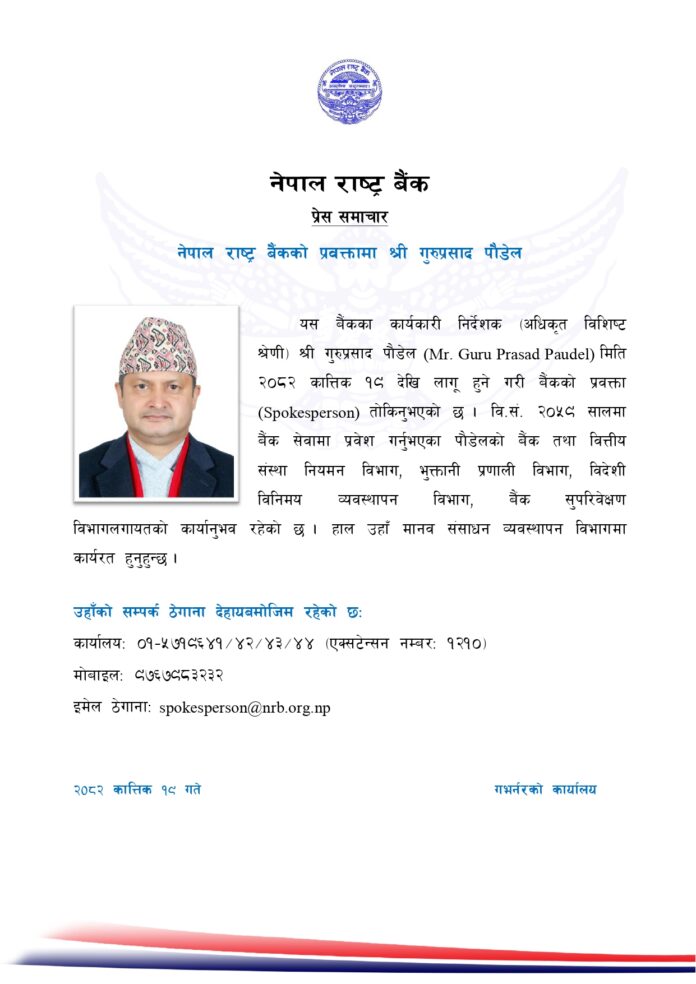 विराटचोकः नेपाल राष्ट्र बैंकले कार्यकारी निर्देशक गुरुप्रसाद पौडेललाई बुधबारदेखि लागू हुने गरी बैंकको प्रवक्ता तोकेको छ ।