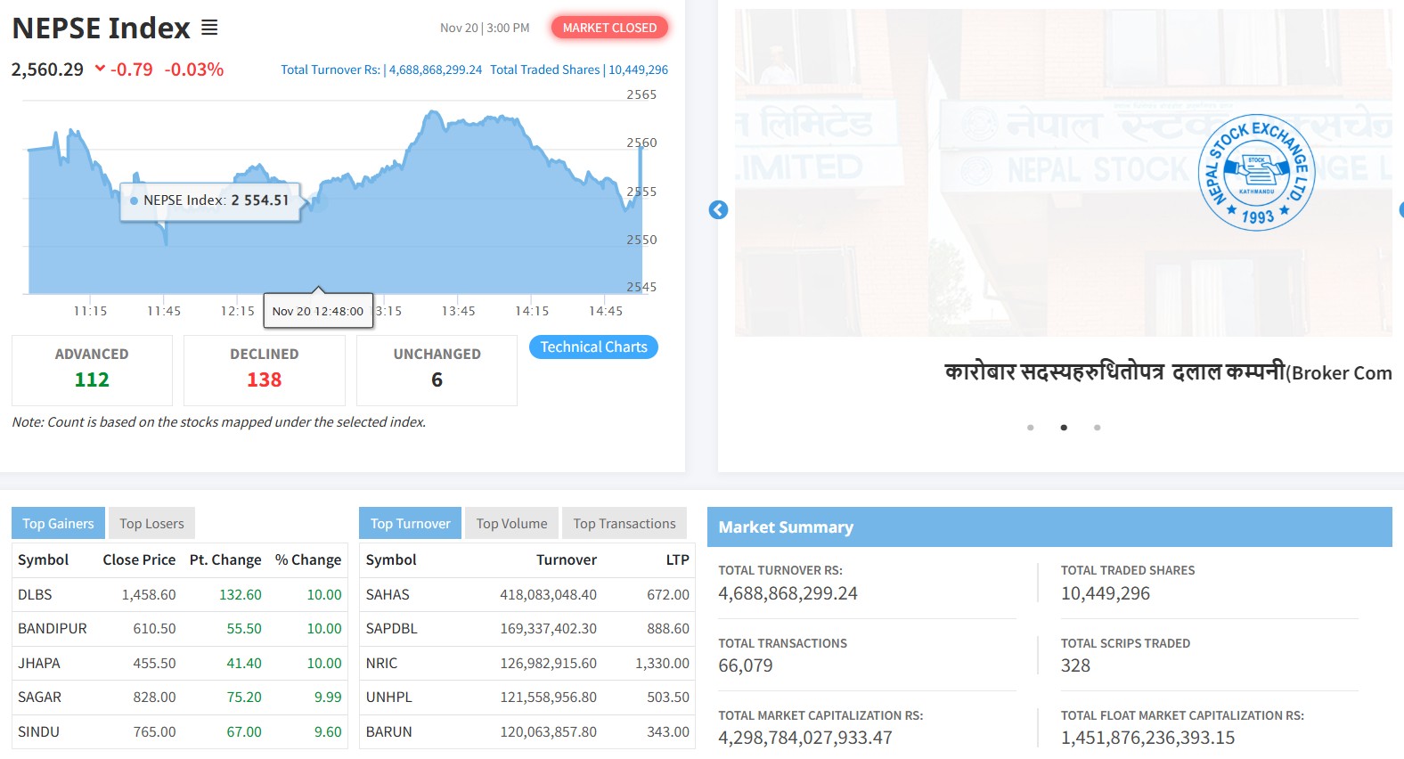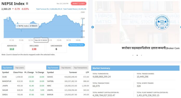 विराटचोकः साताको अन्तिम कारोबार दिन आज नेपाल स्टक एक्सचेञ्च (नेप्से) परिसूचक ०.०३ प्रतिशत अर्थात् ०.७९ अङ्कले घटेर २ हजार ५६०.२९ बिन्दुमा अडिएको छ ।