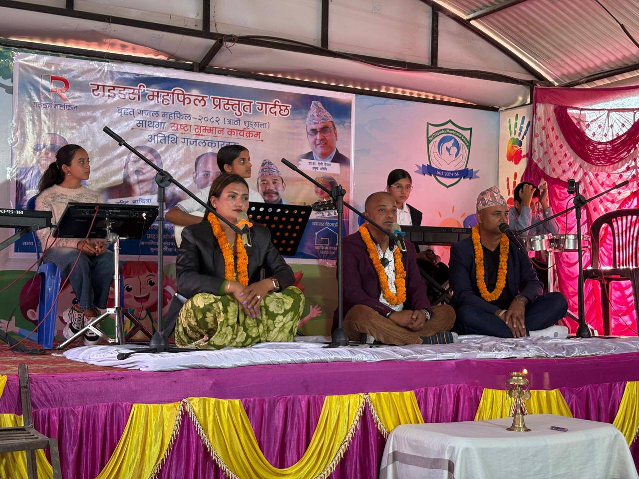 महफिलमा सप्तक कला केन्द्र सुन्दरहरैँचाका निर्जला दाहाल, समीक्षा दाहाल, अनु पाण्डे र सोफिया विष्टले पुराना नेपाली गीत गाएर उपस्थितलाई मख्ख पारेका थिए । राइडर्स महफिलले हरेक वर्ष नयाँ तथा पुराना गजलकारलाई एकै ठाउँमा भेला गराएर महफिलका माध्यमबाट साहित्यानुरागीलाई गजल सुनाइरहेको व्यवस्थापक यादव भट्टराई बताउनुहुन्छ ।