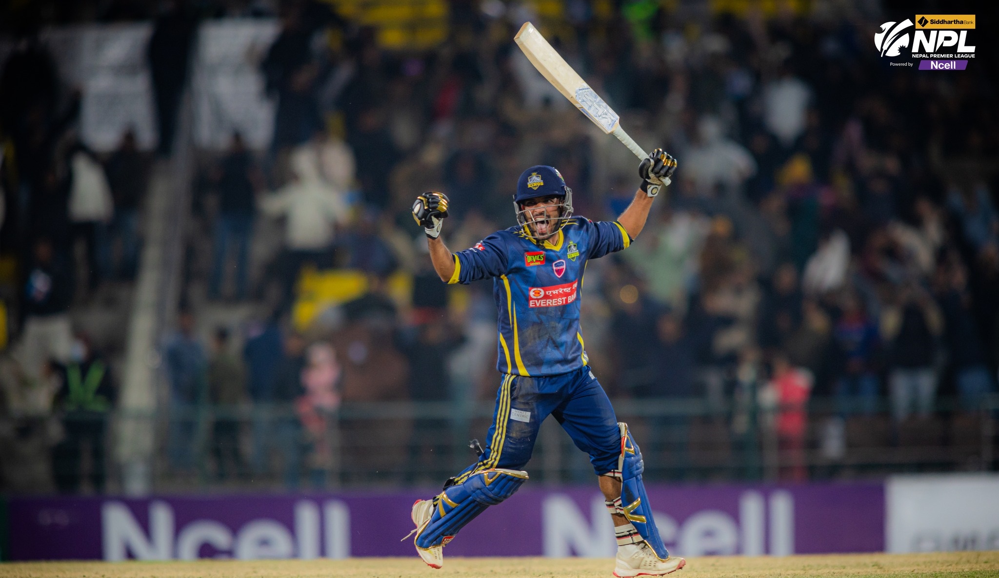 उनको यस सिजन यो दोस्रो अर्धशतक हो । पहिलो खेलमा उनले चितवनविरुद्ध अर्धशतक प्रहार गरेका थिए । यस्तै अष्ट्रेलियन खेलाडी विलियम बोसिस्टोले अविजित ४८ रनको योगदान गरे । बोसिस्टोले ४८ बल खेल्दा २ चौका प्रहार गरे ।
