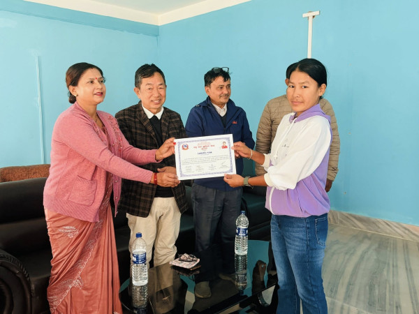 उनीहरूलाई प्रमाणपत्र प्रदान गरी तालिमको समापन गरिएको छ । पशु सेवा तालिम केन्द्र दुहबीका कार्यालय प्रमुख कुमारसिंह खत्रीको अध्यक्षतामा भएको समापन कार्यक्रममा लेटाङ नगरपालिकाका नगर प्रमुख भुपेन्द्रकुमार लावतीको प्रमुख आतिथ्यता रहेको थियो । सो अवसरमा उपप्रमुख कृष्णकुमारी निरौला, योजना शाखा प्रमुख चेतनाथ गौतम, पशुपन्छी शाखा प्रमुख अडिमर्दन श्रेष्ठ लगायतको आतिथ्यता रहेको थियो ।