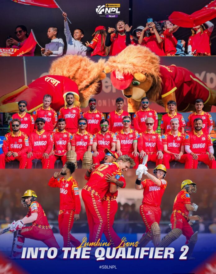 काठमाडौंः हिजो भएको एलिमिनेटर खेलमा लुम्बिनी लायन्सले काठमान्डु गोर्खाजलाई ४ विकेटले पराजित गर्दै सिद्धार्थ बैंक नेपाल प्रिमियर लिग (एनपीएल)को दोस्रो क्वालिफायरमा प्रवेश गरेको छ ।