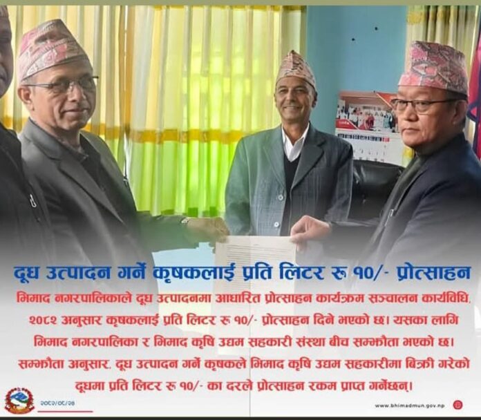 दूध उत्पादनमा आधारित प्रोत्साहन कार्यक्रम सञ्चालन कार्यविधि, २०८२ अनुसार किसानलाई प्रतिलिटर रु १० अनुदान दिने निर्णय भएको नगरप्रमुख दधिराज सुवेदीले जानकारी दिनुभयो । नगरपालिका र भिमाद कृषि उद्यम सहकारी संस्थाबीच त्यससम्बन्धी सम्झौता भएको छ । सम्झौताअनुसार दूध उत्पादन गर्ने किसानलाई भिमाद कृषि उद्यम सहकारीले उक्त रकम प्रदान गर्नेछ ।