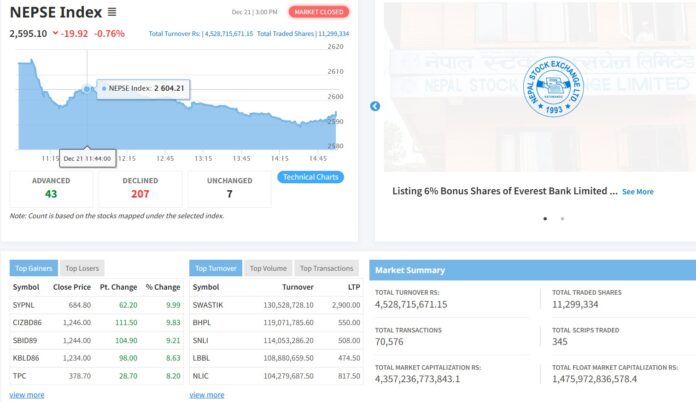 विराटचोकः तीन दिन लगातार बढेको शेयर बजार आज लगातार दोस्रो दिन पनि झरेको छ । आज नेपाल स्टक एक्सचेञ्च (नेप्से) परिसूचक ० दशमलव ७६ प्रतिशत अर्थात १९ दशमलव ९२ अङ्कले घटेर २ हजार ५९५ दशमलव १० विन्दुमा झरेको छ ।