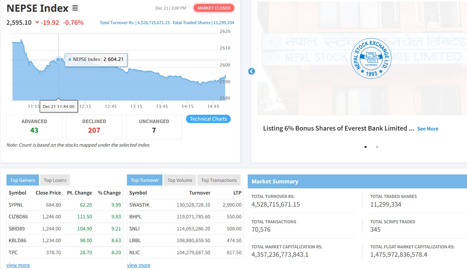 बजार घटेसँगै समग्र बजार पूँजीकरण ४३ खर्ब ५७ अर्ब २३ करोड ६७ लाख ७३ हजार ८४३ रुपैयाँ कायम भएको छ ।