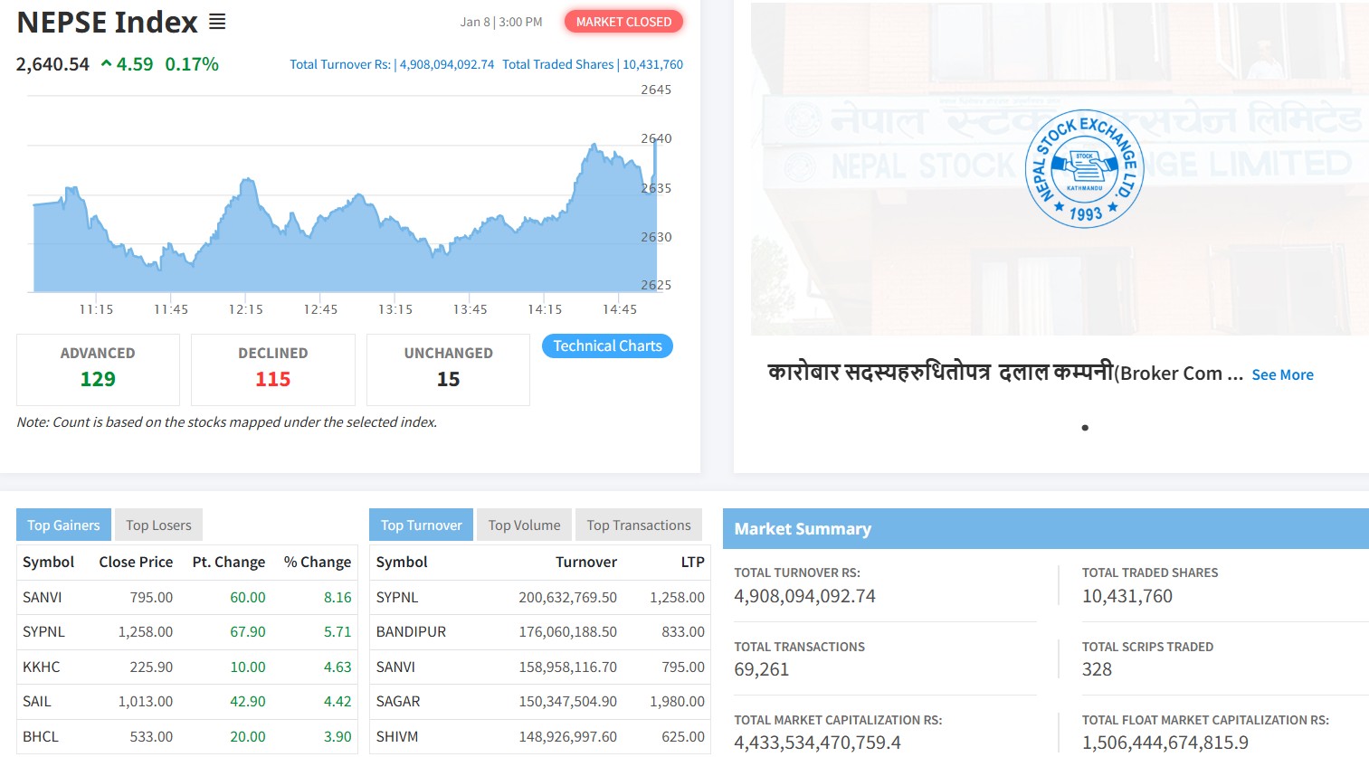 नेप्सेमा सूचीकृतमध्ये ३२८ कम्पनीको १ करोड ४ लाख ३१ हजार ७६० कित्ता शेयर ६९ हजार २६१ पटक किनबेच हुँदा ४ अर्ब ९० करोड ८० लाख ९४ हजार ९२ रुपैयाँको शेयर कारोबार भएको छ । हिजो ५ अर्ब १७ करोड रुपैयाँभन्दा बढीको शेयर किनबेच भएको थियो ।