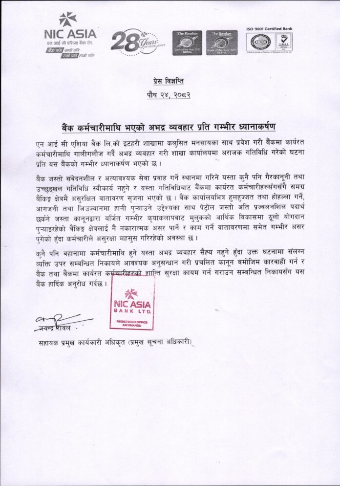 बैंकमा कार्यरत कर्मचारीमाथि केही व्यक्तिले कार्यालयमा पेट्रोल छर्किने प्रयास गरेपछि बैंकले प्रमुख सूचना अधिकारी जयन्द्र रावलको हस्ताक्षरमा विज्ञप्ति जारी गरेको हो ।