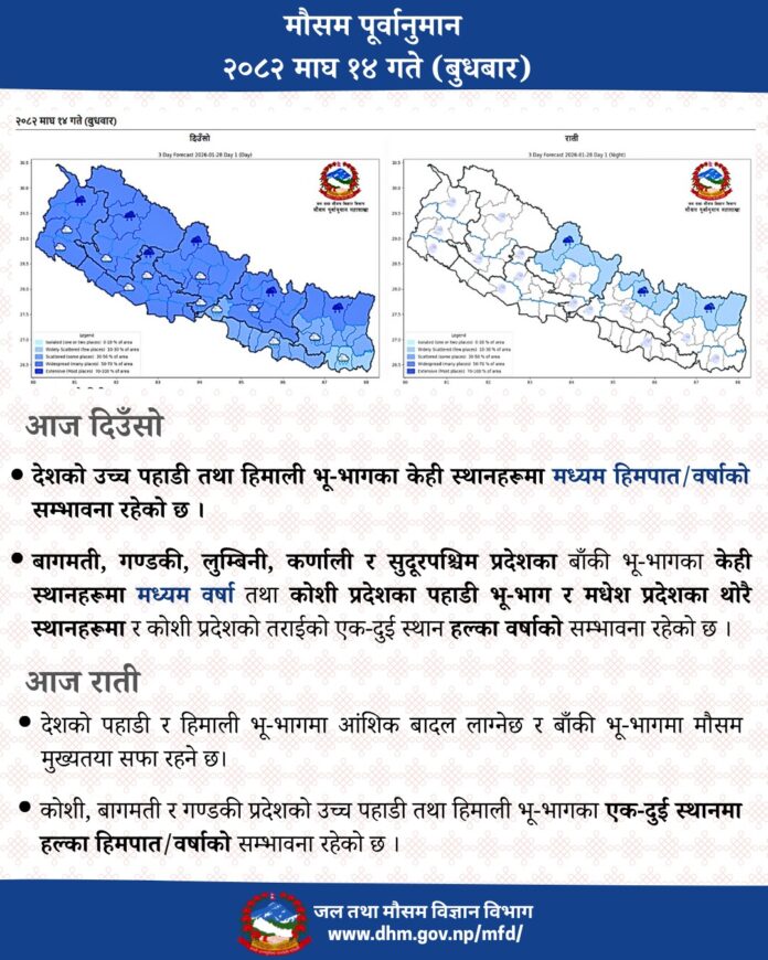 बुधबार दिउँसो देशको उच्च पहाडी तथा हिमाली भू–भागमा पूर्णतया बादल लाग्नेछ र बाँकी पहाडी र तराईका भू–भागमा साधारणतया बादल लाग्नेछ । त्यस्तै उच्च पहाडी तथा हिमाली भू–भागका केही स्थानहरूमा मध्यम वर्षा र हिमपातको सम्भावना रहेको महाशाखाले जनाएको छ ।
