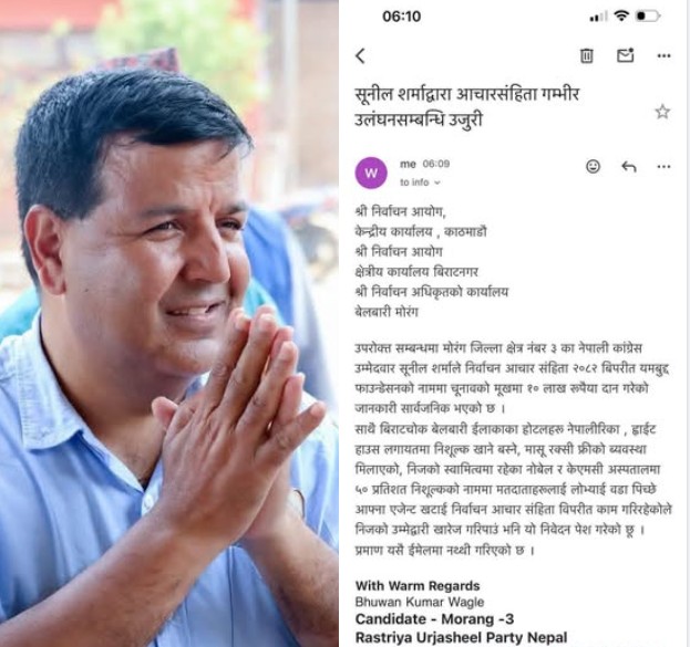 बेलबारीः मोरङ–३ मा नेपाली कांग्रेसका उम्मेद्वार सुनिल शर्माविरुद्ध निर्वाचन आयोगमा उजुरी परेको छ । उनले चुनाव प्रचारका क्रममा १० लाख रुपैयाँ बाँडेको आरोप लागेको छ ।