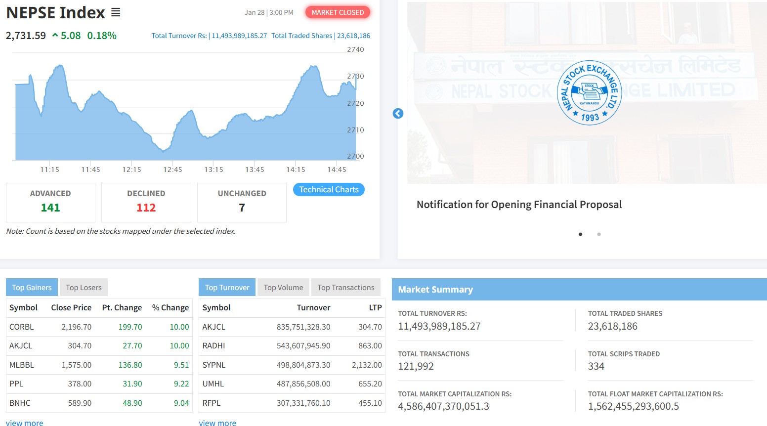 नेप्सेमा सूचीकृतमध्ये ३३४ कम्पनीको २ करोड ३६ लाख १८ हजार १८६ कित्ता शेयर १ लाख २१ हजार ९९२ पटक किनबेच हुँदा ११ अर्ब ४९ करोड ३९ लाख ८९ हजार १८५ रुपैयाँको शेयर कारोबार भएको छ । हिजो १४ अर्ब १६ करोड ७१ लाख रुपैयाँको शेयर किनबेच भएको थियो ।