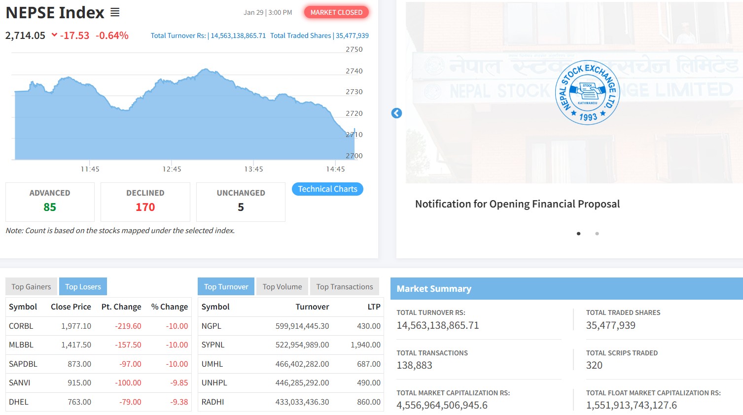 विराटचोकः साताको अन्तिम कारोबार दिन बिहीबार नेपाली शेयर बजार १७.५३ अङ्कले घटेर २ हजार ७१४.०५ अडिएको छ ।