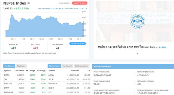 नेप्सेमा सूचीकृतमध्ये ३३० कम्पनीको १ करोड ७५ लाख ७ हजार ७७६ कित्ता शेयर ९१ हजार ६१ पटक किनबेच हुँदा ८ अर्ब २२ करोड ३९ लाख ६५ हजार ६६९ रुपैयाँको शेयर कारोबार भएको छ ।