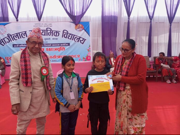 दुलारीः मोरङ जिल्लाको सुन्दरहरैंचा नगरपालिका वडा नम्बर ६ मा रहेको साजीलाल माध्यमिक विद्यालयले विद्यालयको ६० औँ वार्षिकोत्सवको अवसर पारेर १३२ जना विद्यार्थीलाई छात्रवृत्ति प्रदान गरेको छ ।