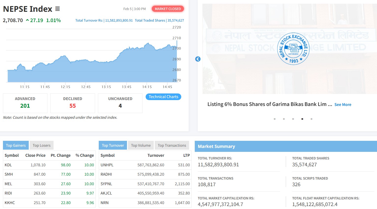 विराटचोकः साताको अन्तिम कारोबार दिन बिहीबार नेपाल स्टक एक्सचेञ्च (नेप्से) परिसूचक १.०१ प्रतिशत अर्थात २७.१९ अङ्कले बढेर २ हजार ७०८.७० बिन्दुमा अडिएको छ ।