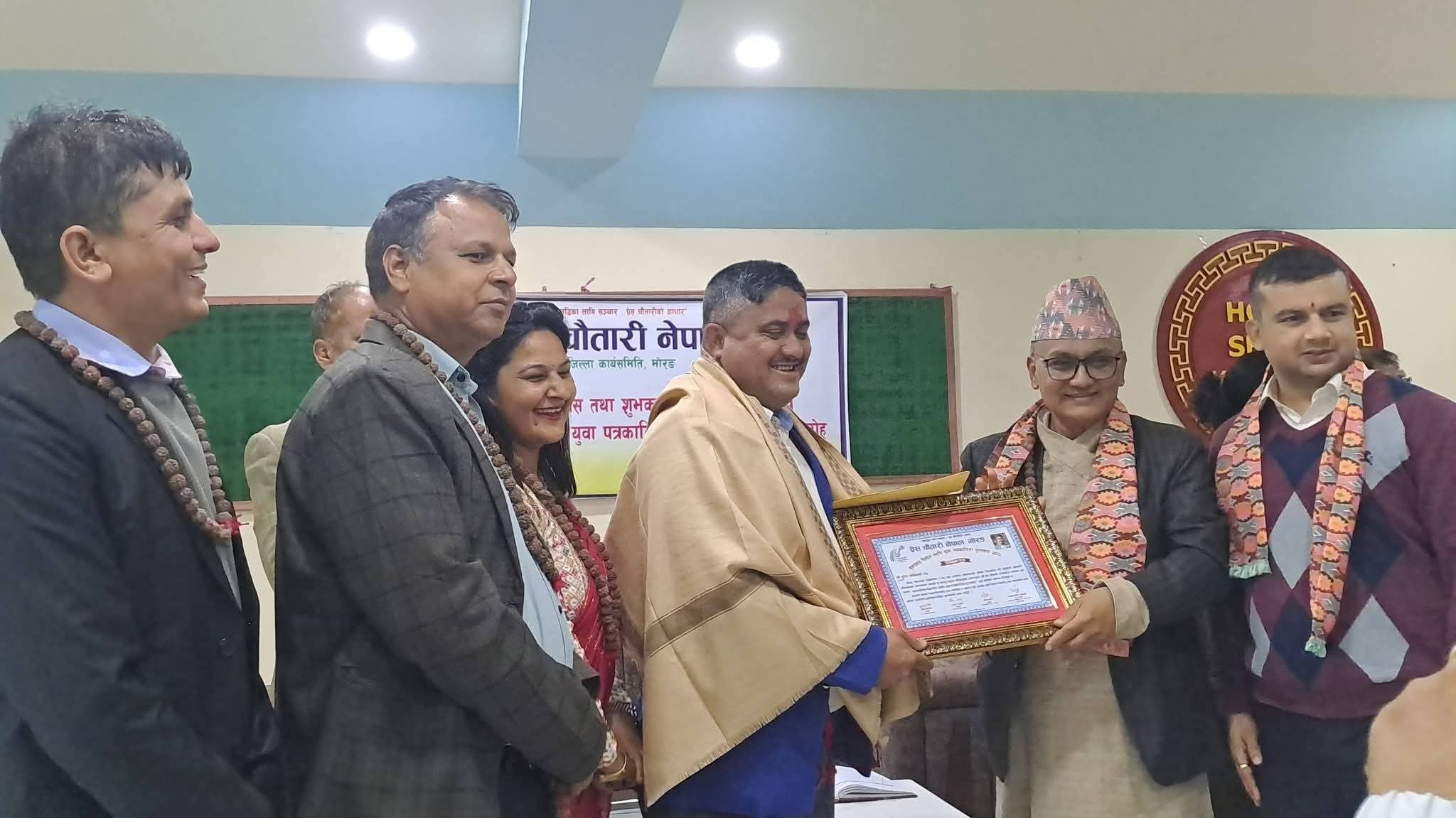 अधिकारीलाई दोसल्ला ओढाएर सम्मानपत्रसहित नगद १७ हजार रुपैयाँ प्रदान गरिएको हो । कार्यक्रममा केक काटेर प्रेस चौतारी नेपालको स्थापना दिवस मनाइएको थियो ।