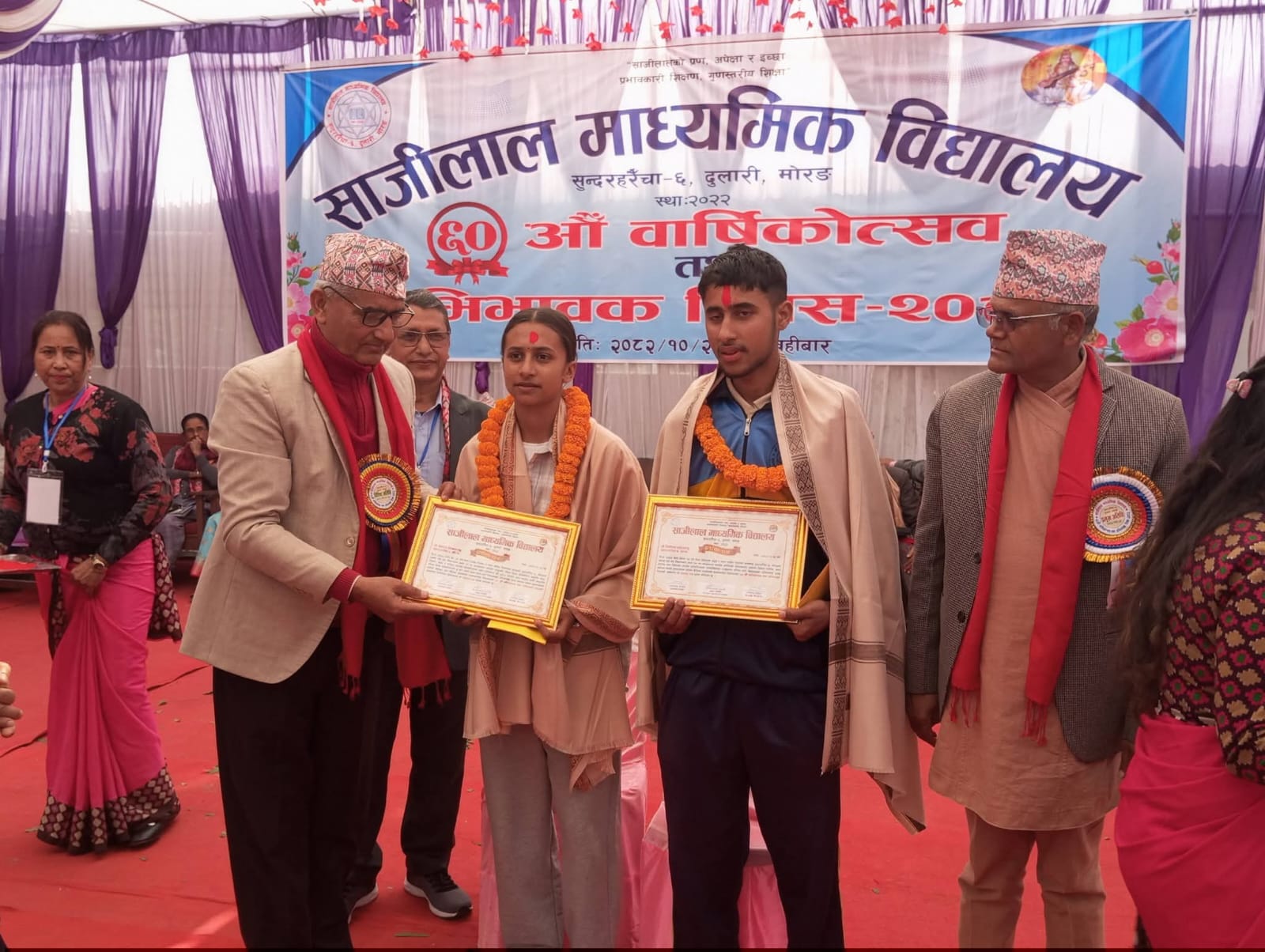 दुलारीः सुन्दरहरैंचाको साजीलाल माध्यमिक विद्यालयले विद्यालयको ६० औँ वार्षिकोत्सवको अवसर पारेर ‘क्वीज हिरो’ र ‘रनर क्वीन’को सम्मान दिँदै दुई जना विद्यार्थीलाई सम्मान गरेको छ ।