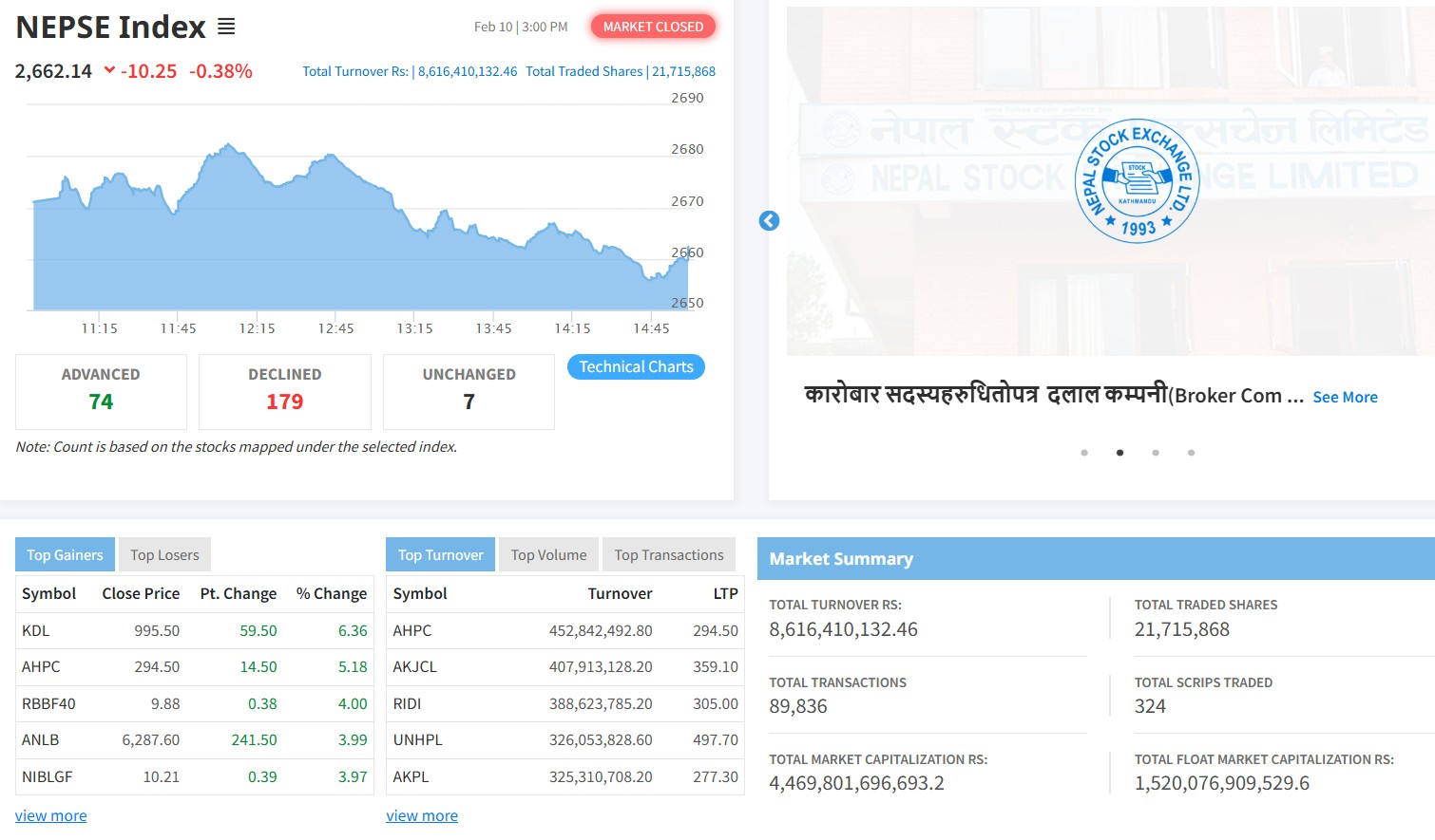 विराटचोकः साताको तेस्रो कारोबार दिन आज पनि शेयर बजार परिसूचक मापक नेपाल स्टक एक्सचेञ्च (नेप्से) ०.३८ प्रतिशत अर्थात् १०.२५ अंकले घटेर २ हजार ६६२.१४ अङ्कमा अडिएको छ ।
