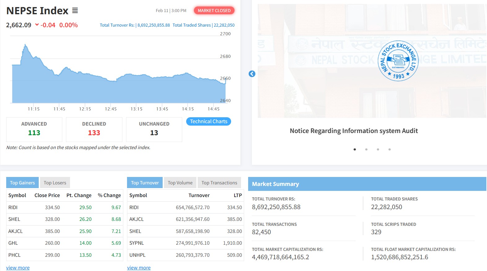नेप्सेमा सूचीकृत मध्ये ३२९ वटा कम्पनीको २ करोड २२ लाख ८२ हजार ५० कित्ता शेयर ८२ हजार ४५० पटक किनबेच हुँदा ८ अर्ब ६९ करोड २२ लाख ५० हजार ८५५ रुपैयाँको शेयर कारोबार भएको छ ।