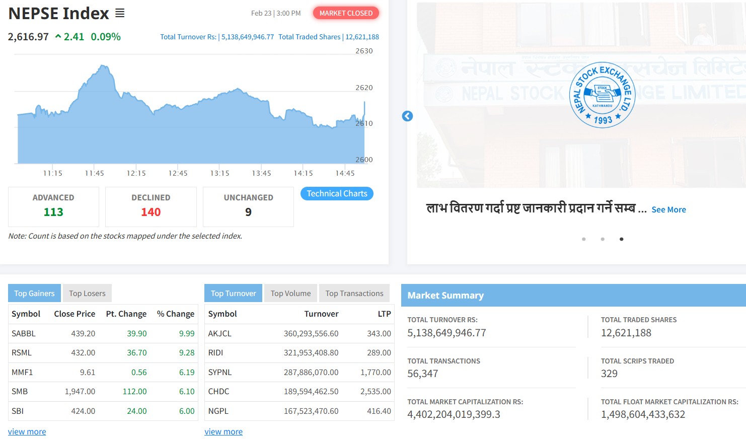 आज नेपाल स्टक एक्सचेञ्ज (नेप्से) परिसूचक ०.०९ प्रतिशत अर्थात् २.४१ अङ्कले बढेर २,६१६.९७ विन्दुमा पुगेको छ । बजार बढे पनि कारोबार रकम भने घटेको छ ।