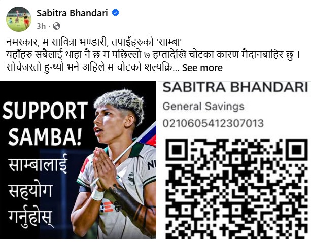 विराटचोकः नेपाली महिला राष्ट्रिय फुटबल टोलीकी कप्तान तथा चर्चित फरवार्ड सावित्रा भण्डारी ‘साम्बा’ यतिबेला गम्भीर घुँडाको चोटका कारण मैदानबाहिर छिन् ।