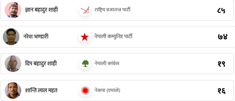 नेपाली कम्युनिष्ट पार्टीका नरेश भण्डारीले ७४, नेपाली कांग्रेसका दीपबहादुर शाहीले १९ र नेकपा एमालेका शान्तिलाल महतले १६ मत पाएका छन् ।