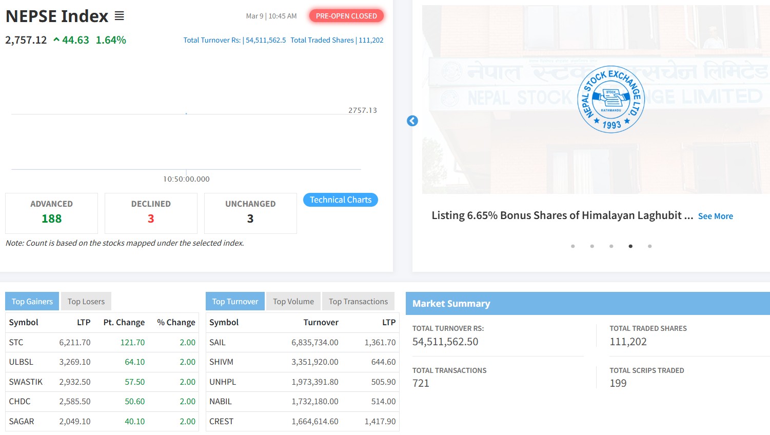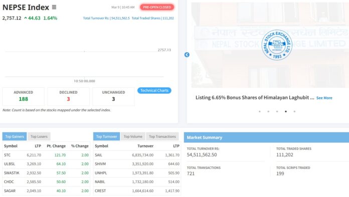 निर्वाचनको प्रत्यक्षतर्फको अन्तिम मत परिणाम सार्वजनिक भइसक्न लागेको र रास्वपाले झण्डै दुई तिहाइ हाराहारी सिट ल्याउने सङ्केतका बीच बजार खुलेको हो । चुनावपछिको पहिलो कारोबारको दिन आज शेयर बजारको प्रि ओपन सेसनमा १ दशमलव ६४ प्रतिशत अर्थात् ४४ दशमलव ६३ अङ्क बढेर २७५७ दशमव १२ अङ्कमा रोकिएको छ ।