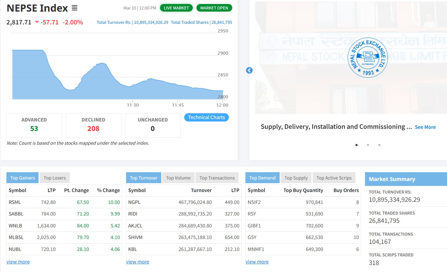 नेपाल स्टक एक्सचेञ्जका अनुसार दिउँसो १२ बजेसम्ममा नेप्से सूचक २ प्रतिशत अर्थात् ५७ दशमलव ७१ अंक घटेको छ । सो अवधिमा १० अर्ब ८९ करोड रुपैयाँको शेयर किनबेच भएको छ ।