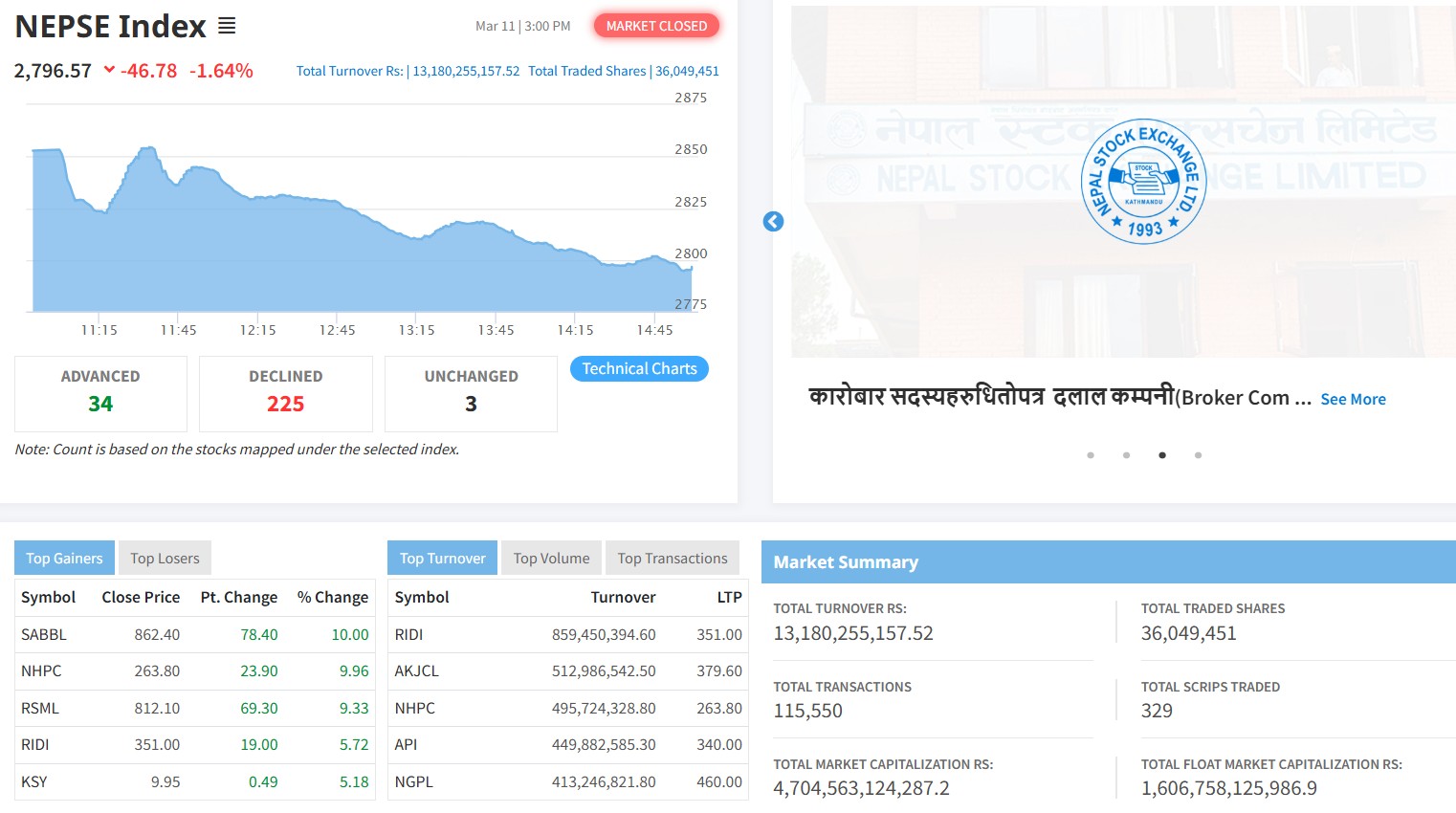 विराटचोकः सोमबार लगातार तीन सर्किट लागेर १२ बजे नै बन्द भएको शेयर बजारमा मंगलबार र बुधबार नाफा बुक गर्ने बिक्रेता हाबी भएका छन् । मंगलबार उच्च अंकले घटेको नेप्से परिसूचक बुधबार पनि ४६.७८ अंक अर्थात् १.६४ प्रतिशतले घटेर २७९६.५७ विन्दुमा अडिएको छ ।