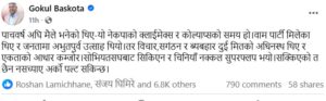उनले फेसबुकमा लेखेका छन्, “पाँच वर्ष अघि मैले भनेको थिएँ– यो नेकपाको क्लाईमेक्स र कोल्याप्सको समय हो । वाम पार्टी मिलेका थिए र जनतामा अभूतपूर्व उत्साह थियो । तर विचार, संगठन र व्यवहार दुई मितको अधीनस्थ थिए र एकताको आधार कमजोर । सोभियत संघबाट सिकिएन र चिनियाँ नक्कल सुपरफ्लप भयो । सक्किएको त छैन, नसच्याए अर्को पल्ट सकिन्छ ।”