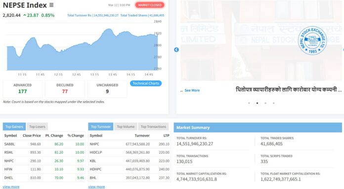 मंगलबार र बुधबार घटेको शेयर बजार हिजो बिहीबार भने ० दशमलव ८५ प्रतिशत अर्थात् २३.८७ अंकले बढेर २८२०.४४ विन्दुमा अडिएको छ ।