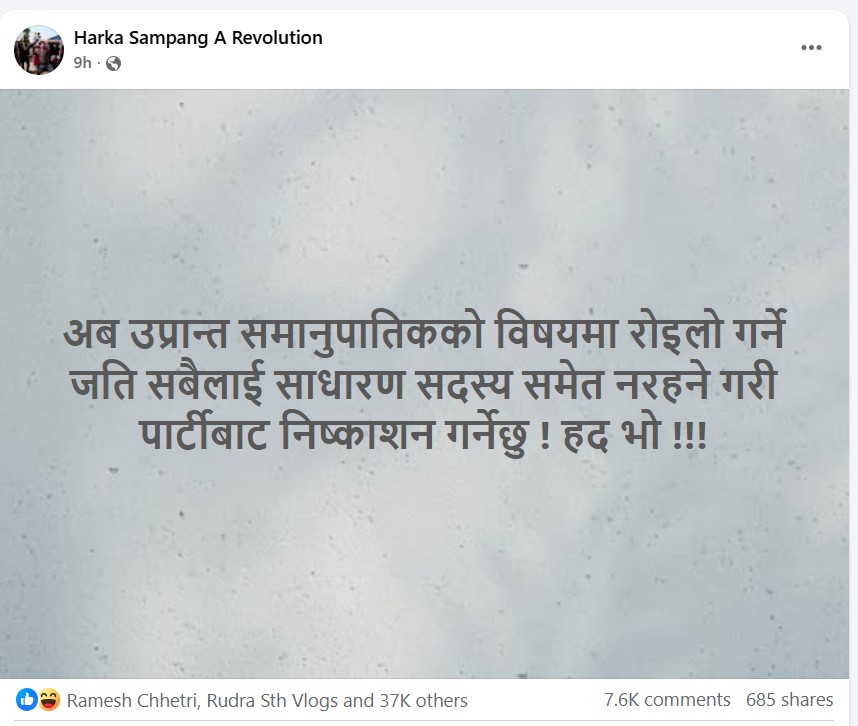 बिहीबार राति करिब ८ बजेतिर ‘भात खाऊ मेरो टाउको नखाऊ’ भनेर फेसबुकमा लेखेका साम्पाङले राति १० बजे फेरि ‘अब उप्रान्त समानुपातिकको विषयमा रोइलो गर्ने जति सबैलाई साधारण सदस्य समेत नरहने गरी पार्टीबाट निस्कासन गर्नेछु ! हद भो !!!’ लेख्नुभएको छ ।