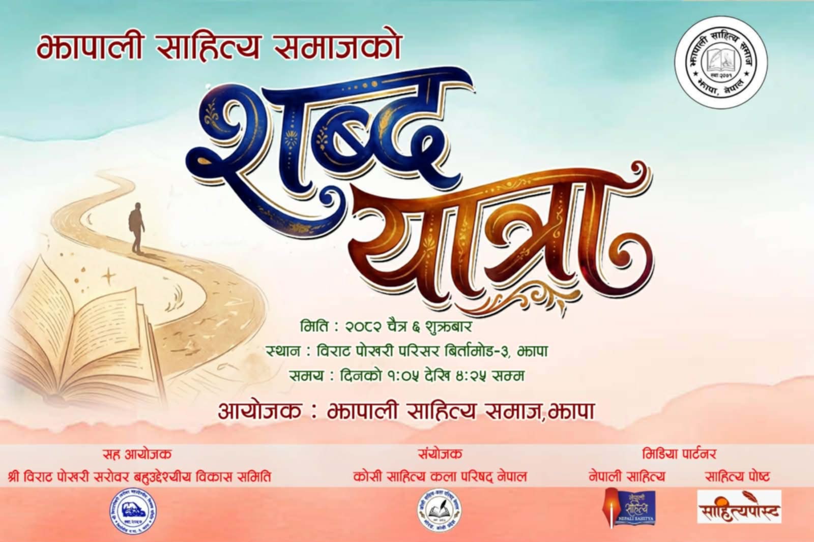 बिर्तामोडः झापाली साहित्य समाजको आयोजना तथा विराट पोखरी सरोवर बहुउद्देश्यीय विकास समितिको सह आयोजनामा शुक्रबार र शनिबार झापाका विभिन्न स्थानमा शब्दयात्रा कार्यक्रम हुने भएको छ ।