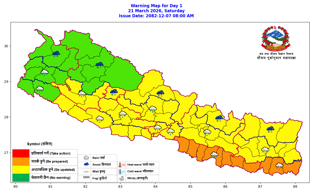 महाशाखाका अनुसार कोशी, मधेश, बागमती र गण्डकी प्रदेशका धेरै स्थानहरू तथा लुम्बिनी, कर्णाली र सुदुर पश्चिम प्रदेशको केही स्थानहरूमा मेघगर्जन र चट्याङ्गसहित असिना तथा हावाहुरीसहित मध्यम वर्षा र हिमपातको सम्भावना छ ।