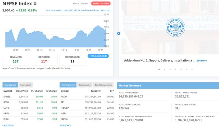 विराटचोकः आज पनि शेयर बजार बढेको छ । आज नेप्से परिसूचक २३.८३ अङ्कले बढेर २९६०.४० बिन्दुमा अडिएको छ । आज नेप्सेमा सूचीकृत ३४१ कम्पनीको ३ करोड ५८ लाख २२ हजार १९१ कित्ता शेयर १ लाख २६ हजार ९४७ पटक किनबेच हुँदा १४ अर्ब ८३ करोड ९१ लाख ८३ हजार ६४३ रुपैयाँको शेयर कारोबार भएको छ ।